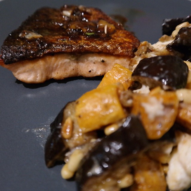 And for dinner, #oriental style panfried #salmon w/ sesame oil, #garlic , soy sauce n honey + a side of roasted spiced #aubergine , #sweetpotato n pine nuts (inspired by @lifelovetravelfood )